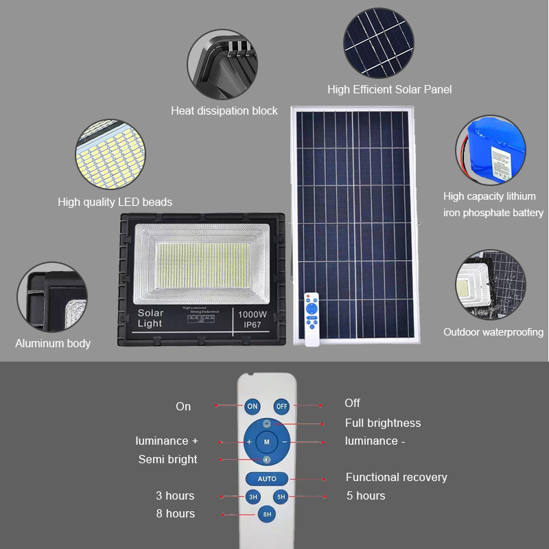 Solar flood light 40W 60W 100W 200W 300W 400W 500W 1000W IP67 aluminum housing 12 hours bright at night